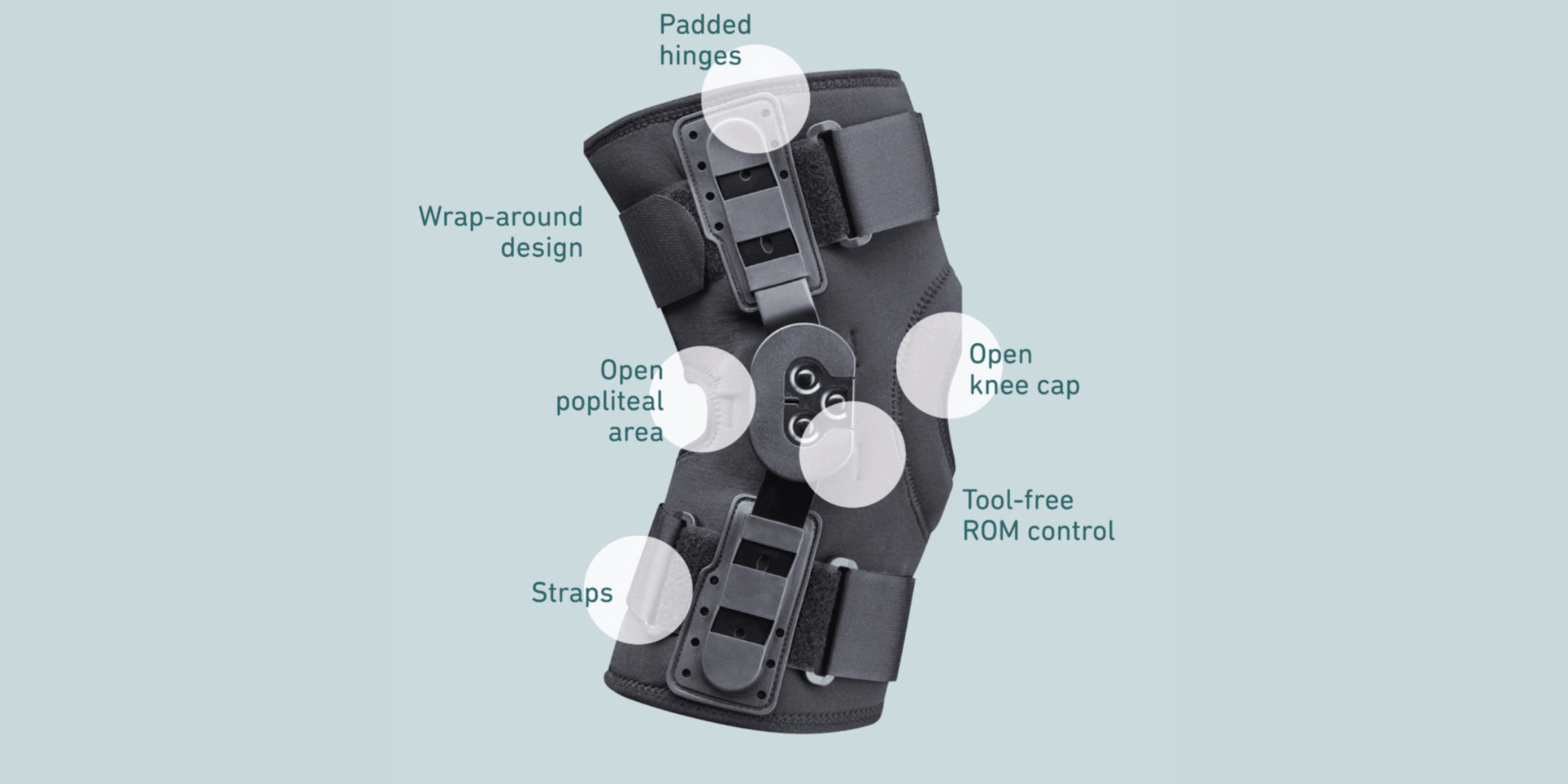 ROM wrap orthosis to improve lateral stability and restrict knee movement.