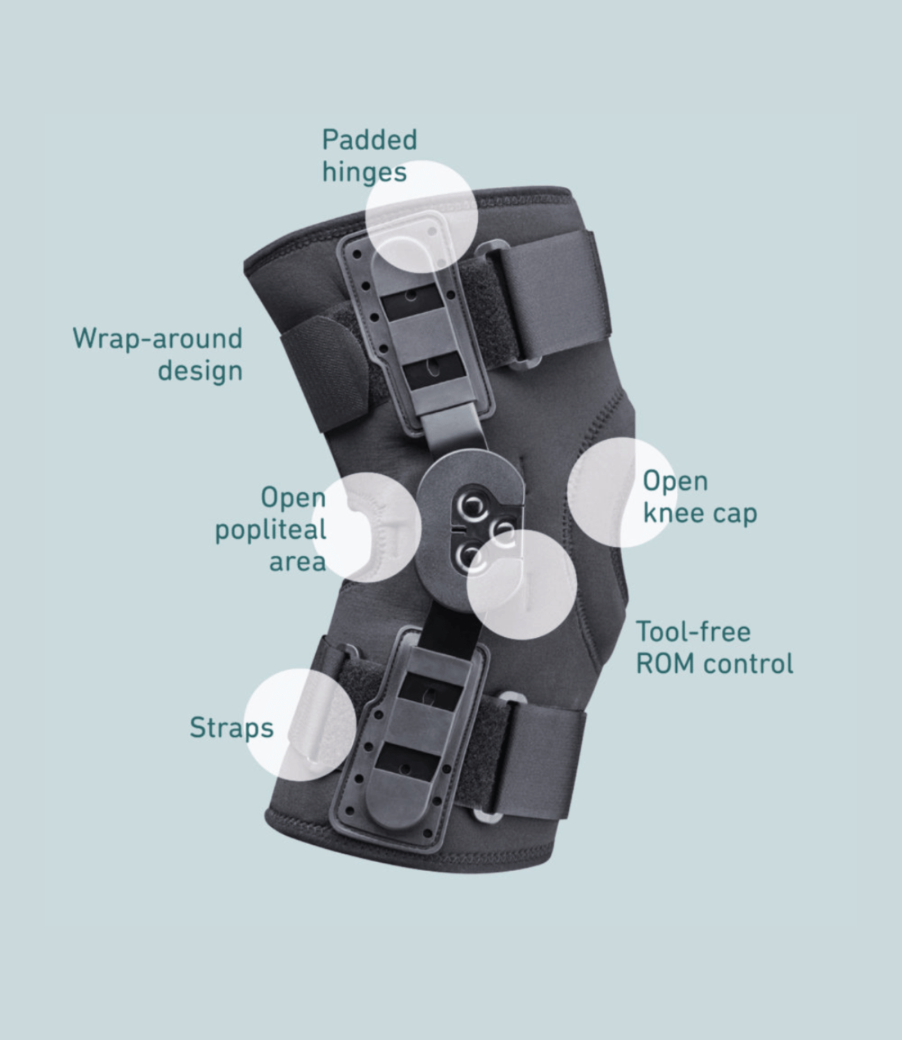 - Cushioned medial and lateral hinges stabilise the knee joint