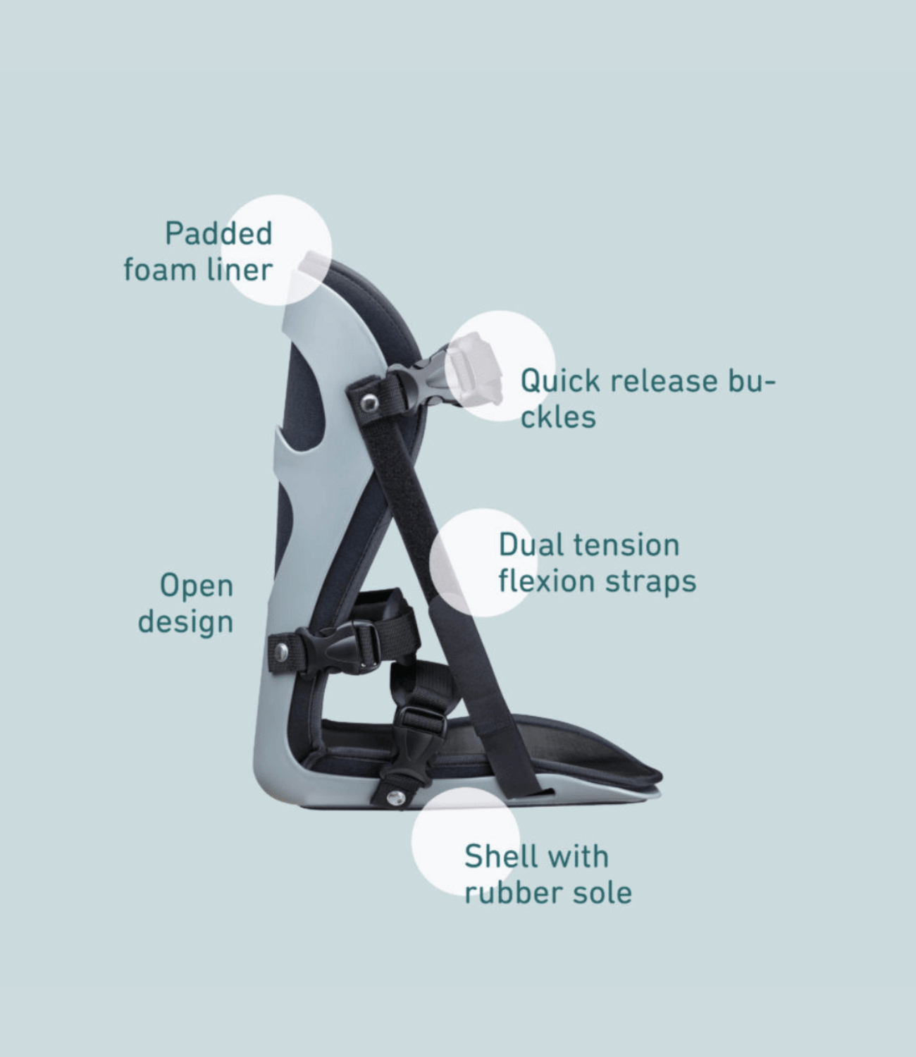 - Dorsal extension can be adjusted with lateral straps and an additional forefoot wedge