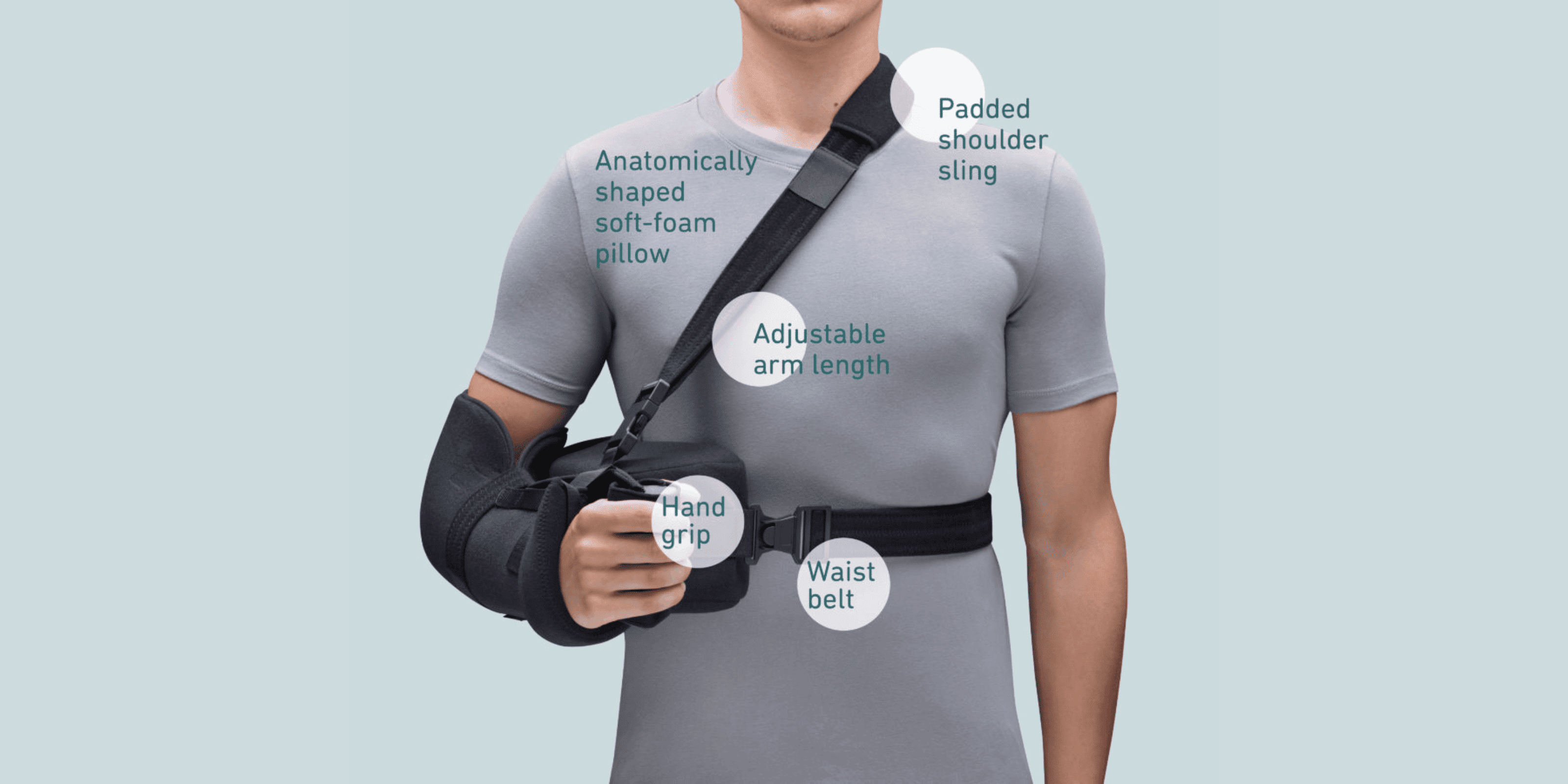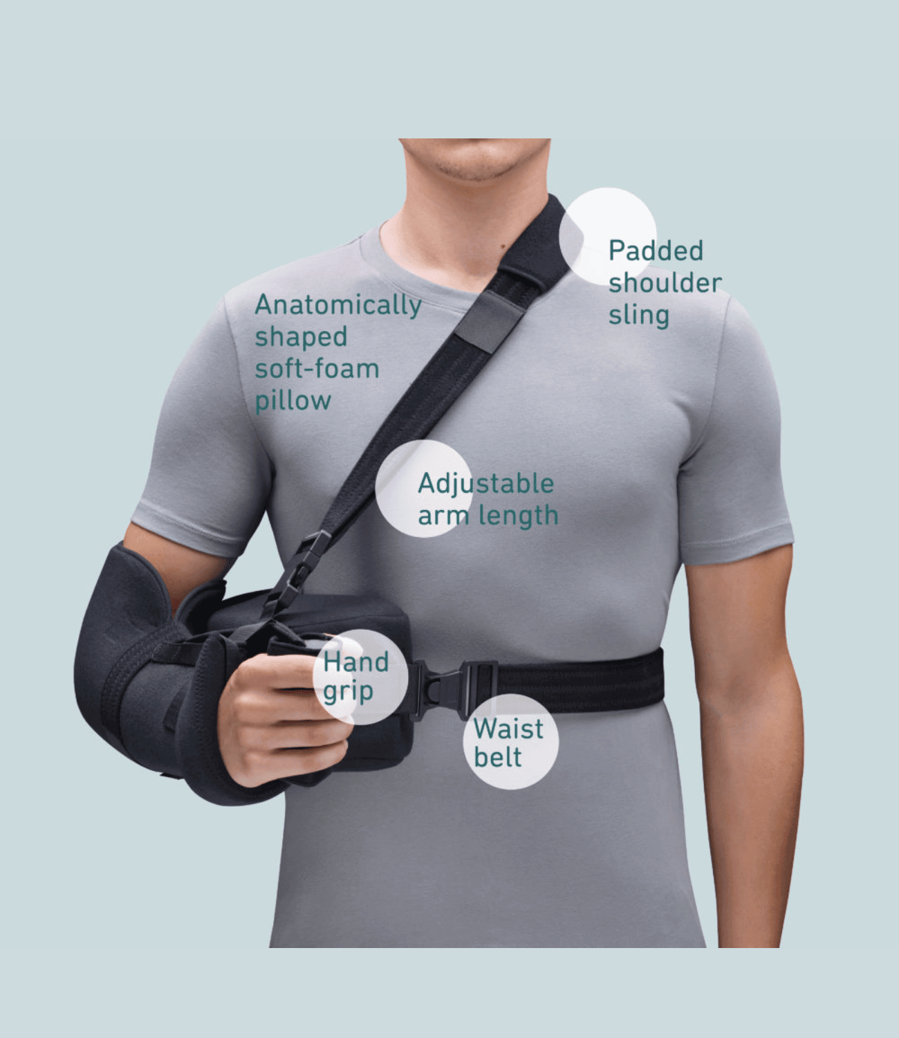 Shoulder sling secures the arm in a 15-degree abduction angle.
